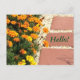 Dies ist ein heller und fröhlicher Blick zu sagen Hallo! Hübsche Gelb- und Orangenschwellen, die an meinen Garten grenzen, mit einem Platzhalter für Ihren persönlichen Gruß, werden auf benutzerdefinierten Postkarten gedruckt. Auf der rechten Seite befinden sich rote Tischplatten und Steinkies, die Kontrast und Akzent verleihen. Hallo ist in grünen Buchstaben über den mittleren Fertiger geschrieben und kann angepasst werden. Vielen Dank für Ihren Einkauf bei CherylsArtFotos auf Zazzle.