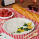 Gelbe Rosen beugen weiße Spitze über Pappteller