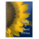 Passen Sie die hübsche Gelbe Sonnenblume auf Blue Wedding Spiral Notebook mit den persönlichen Namen der Braut und Bräutigam und bestimmten Sommer- oder Herbstfeiertag erstellen Sie ein Gästebuch oder ein Ratgeber für die Neuvermählten. Dieses klassische, maßgeschneiderte botanische Hochzeitsbuch zeigt ein nahes Blumenfoto einer gelben Sonnenblumenblüte auf blauem Hintergrund.