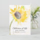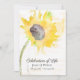 Erleben Sie Ihren Liebsten, nachdem sie mit der eleganten Gelben Sonnenblume in Vase Watercolor Celebration of Life Invitation übernachtet haben. Diese klassische, maßgeschneiderte, blumengeschmückte Gedenkfeier lädt mit einem digital Aquarell bemalten Blumenfoto einer gelben Sonnenblumenblüte auf einem grünen Stamm in einer Glasvase mit weißem Hintergrund ein. Personalisieren Sie es mit einem Bild, dem Namen des Verstorbenen und dem Datum der Geburt und des Todes. Erhältlich als gedruckte Einladung zum Verschicken und/oder als digitaler Download für den einfachen digitalen Austausch online.