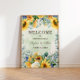 Hübsche rustikale gelbe Sonnenblumen und schlängelgrüne Eukalyptus verlasse ein Hochzeitsposter mit Text: "Willkommen bei unserer Hochzeit." Personalisiert mit den Namen der Braut und des Bräutigams und ihrem Hochzeitstag.
