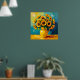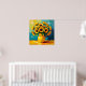 Poster mit einer prächtigen Abbildung einer gelben Sonnenblume in einer hübschen gelben Vase im Stile eines Impasto und einem aquamarinen oder türkisfarbenen Hintergrund.
