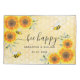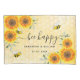 Ein Hochzeitsgeschenk oder Sake. Ein goldener Hintergrund mit einem Bienenwabenmuster und glücklich lächelnden Hummeln. Gelbe und orangefarbene Sonnenblumen, Blumen und Grünpflanzen. Personalisieren und die Namen des Paares. schwarze Buchstaben. Der Text: sei glücklich geschrieben mit einem modernen, großen handgeschriebenen Stil Skript mit Swashes. Eine passende Bettdecke ist in unserem Shop erhältlich!