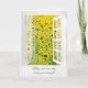 Offenes weißes Fenster mit schieren Vorhängen und gelbem Sonnenblumenfeld zum Beileid. Alle Texte können geändert werden.