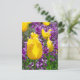 Eine hellgelbe Tulpe mit violetten Blumen verleiht dem Ganzen eine lebendige, blumengeschmückte Postkarte.