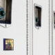 Eines von drei Dingen gelb: durch ein Fenster auf eine Vase aus Tulpen schauend, drei Frauen in farbenfrohen Kleider, und ein gedämpfter Regenbogen über einem Hintergrund aus gelben Kisten.