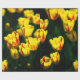Auf einem Blumenbeet zaubern Blume in Gelb und Rot. Sonnenlicht und dunkelgrüner Hintergrund. Tulpen sehen aus wie brennende Kerzen. Gelbe Tulpe steht für Hoffnung, Fröhlichkeit und helles und rätselhaftes Lächeln.