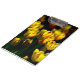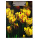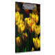 Auf einem Blumenbeet zaubern Blume in Gelb und Rot. Sonnenlicht und dunkelgrüner Hintergrund. Tulpen sehen aus wie brennende Kerzen. Gelbe Tulpe steht für Hoffnung, Fröhlichkeit und helles und rätselhaftes Lächeln.