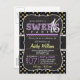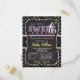 Niedlich Sweet 16, 16, Einladung auf gelbe, schwarze und graue Sterne, sterniges Nachtmuster mit lila Rack-Designelementen. 16., 16. Geburtstagsparty für Mädchen. Vintag fühlen sich mädchenhaft lila und gelb Kreide Schriftart auf coolem schwarzen Brett Hintergrund.
