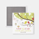 Eine niedliche und skurrile Illustration von zwei gelben und roten Livebirds, die auf einem Herzbaum mit Herzsaiten stehen. Dadurch wird der Datums-Magnet mit einer passenden Hochzeitseinladung gespeichert.