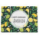 Eine Geburtstagsgeschenktüte mit niedlichem Muster aus gelben Zitronen und Limonen grünen Früchten mit Stalks aus Blätter Set auf dunkelgrünem Hintergrund.