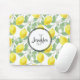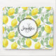 Ein Mauspad, der mit einem Monogramm-Initial personalisiert ist und in einem weißen Kreis mit einem schwarzen Rand einen Namen trägt. Entworfen mit gelben Zitronen und grünen Blätter, in einem sich wiederholenden Muster.