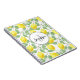 Ein Wendelheft personalisiert mit einem Monogramm-Initial und Name in einem weißen Kreis mit einem schwarzen Seilrand. Entworfen mit gelben Zitronen und grünen Blätter, in einem sich wiederholenden Muster.