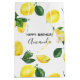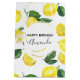 Eine Geburtstagsgeschenktüte mit niedlichen gelben Zitronen mit grünen Blätter und frisch geschnittenen Zitronenscheiben. Ein weißer Kreis, oben mit dem Text, der sich darin befindet.