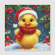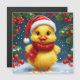 Ein fröhliches, gelbes Entlein mit Weihnachtsmannmütze und Rotschal inmitten festlicher Weihnachtsdekorationen und lebhaftem fallendem Schnee, das den fröhlichen und magischen Geist der Winterferien einfängt.