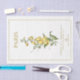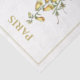 Dekoupage Tissue Paper, das wie eine Vintage französische Titelseite aussieht, mit einer gelben Foxglove-Blume-Abbildung in der Mitte und dem Wort "Paris" oben. Gold Text und Rand.