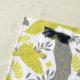 Gelber und ultimativer Grau-Ara-Papagei, der ein tropisches Pattern-Badetuch Zeichne. Handgezeichnet Blätter und tropische Blume in trendigen Gelb- und Grautönen.