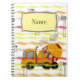 Gelber und roter Betonmischer auf einem Schlüssel- und Hammerhintergrund