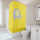 Duschvorhang mit einem grauen, Zickzack Streifen Elefant mit gelben und weißen Zickzack Ohren auf einem hellgelben Zickzack gestreiften Hintergrund.