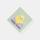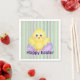 Dieses niedliche Baby-Küken bricht aus diesem lila Ei, um Ihnen ein glückliches Ostern zu wünschen. Der Hintergrund dieses Designs besteht aus rosa, lila und dunkelgrünen Streifen. Das hellgrün kann mit einer Farbe Ihrer Wahl angepasst werden.