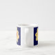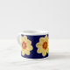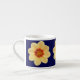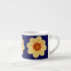 Genießen Sie Ihren morgendlichen Java in dieser Espressotasse, die das Foto einer gelben Dahlia-Blume auf einem marineblauen Hintergrund in einem sich wiederholenden Muster zeigt. Ein schönes, blumengeschmücktes Design!