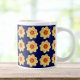 Genießen Sie eine Tasse Kaffee, Tee oder heiße Schokolade in dieser Jumbo-Tasse, die Foto-Umschläge einer gelben Dahlia-Blume auf marinebasischem Hintergrund zeigt und in einem sich wiederholenden Muster gedruckt wird. Ein schönes, blumengeschmücktes Design!
