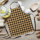 Schürze in der Küche mit einem durchdachten Druckdesign, das das Foto einer gelben Dahlia-Blume auf einem schwarzen Hintergrund zeigt, der in einem sich wiederholenden Muster gedruckt wurde. Ein schönes, blumengeschmücktes Design! Wählen Sie Ihre Schürze aus.
