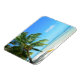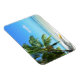 Der Andenkalienmagnet mit einem gelben Kajak unter einer hängenden Palme an einem weißen Sandstrand auf der tropischen Insel Moorea, in der Nähe von Tahiti, im Pazifik, Französisch-Polynesien.