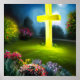 Gelbes leuchtendes Kreuz in einem Garten nachts. Erstellt mit KI-Software.