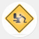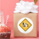 Rundaufkleber eines gelben Verkehrswarnzeichens mit einem Symbol, das über einer Toilette erbricht und einen Kater oder eine Schwangerschaft zeigt.