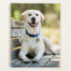 Ein gelber Labrador Retriever Hund lächelt, während er an einem sonnigen Tag auf einer Holzbank im Freien liegt.