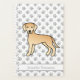 Desteis originelle Cartoon-Illustration eines niedlichen Labrador Retriever Hundes in gelber Fellfarbe. Es gibt auch einen personalisierbaren Textbereich für einen Namen oder Titel. Der Hintergrund hat ein hellgraues Muster von Hundepfauendrucken.