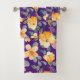 Dieses moderne Badehandtuch-Set besticht durch ein lebhaftes gelbes Blumenmuster auf einer lila Basis. Es wäre das perfekte Geschenk für einen Freund oder ein Familienmitglied.