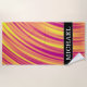 Dieses Badetuch-Ausrüstungsbeschreibungen ein Muster, das gebogenen Kräuselungen im Wasser ähnelt, farbige verschiedene Schatten von Farben wie Gelbes, Orange und Lila. Es kennzeichnet auch einen individuellen Namen in Weiß farbigem Text innerhalb eines Dunkelheit farbigen Bereichs auf der Front. [~Z0000000]
