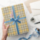 Verpackungspapier mit einem Plaidwerx ursprünglichen karierten Muster im Buttergelb, im Schwarzen, im Taupe und im Elfenbein.