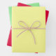 Gelbes Umhüllungspapier, rotes Umhüllungspapierblatt und grünes Umhüllungspapier. Ein Trio aus rotem, gelbem und grünem Packpapier für Geburtstagsgeschenke und mehr.