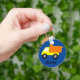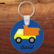 Niedlicher Cartoon-Spielzeug-LKW. Benutzerdefinierte Schlüsselketten. Blauer Hintergrund. Bearbeiten Sie den Namen, um diese Schlüsselketten personalisiert zu machen. Geschenkidee für Kinder.