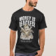 Ein stylischer schwarzer T - Shirt mit einem kühnen Design mit der Phrase "GELD IST FRIEDLICH" und einer künstlerischen Darstellung eines lachenden, von Bargeld und Goldschmuck umgebenen Kirschen. Das Shirt enthält auch den Text "IHRE MARKE" und "GELD IST NICHT ALLES, ABER ALLES BRAUCHT GELD." Ideal für diejenigen, die edgy, Statement-Mode schätzen.