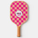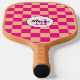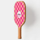 Pfirsichpfirsichfarbenes geometrisches Retro Monogram Pickleball Paddel. Personalisieren Sie Ihre individuelle Eingabe und Ihren eigenen Namen. Cooles, hintergrundgezogenes geometrisches Quadratmuster. Vintages Fliesen modernes Schachbrett Design.