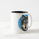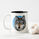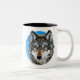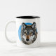 Eine Acrylmalerei eines grauen Wolfs über einem blauen Hintergrund.