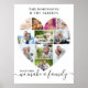 Erstellen Sie Ihr eigenes personalisiertes Poster mit 11 Ihrer Lieblings-Fotos und Ihren Familiennamen(en). Die Fotovorlage ist ein Set, um eine Foto-Collage in der Form einer Liebe-Herz zu erstellen, indem Sie Ihre Bilder in einer Mischung aus Quadrat, Portrait und Landschaft-Formate. Laden Sie Ihre Fotos, die in Reihen arbeiten, von oben nach unten hoch. Das Design hat einen weißen Hintergrund und ist handschriftlich in elegantem Skript mit der Formulierung "zusammen machen wir eine Familie". Ein schönes Design für Ihre Fotos, Hochzeitstag oder ein Geschenk für frisch verheiratete Paare.