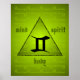 Gemini Horoskop-Zeichen in einem grünen ganzheitlichen Dreieck mit Wiederholung des Gemini-Skripttextes in hellgrün, Geist-Körper-Geist in schwarzem Kontur Schriftart, Farbverlauf Licht in dunkelgrünen Hintergrund. Dieses Design ist sehr vielseitig. Sie können die Wörter "Geist Geist" individuell ändern, um sie auf Wunsch neu zu ordnen; Sie können das Gemini Zodiac Zeichen durch ein eigenes Bild ersetzen; oder Sie können den Hintergrundtext ändern, der etwas komplizierter ist, aber recht schön sein kann. Dieses Design basiert lose auf Theorien der Alchemie, der Naturmagie und der elementaren Interaktion von Chaos und Ordnung. Grün ist eine Farbe von Natur, Wachstum, Kreativität und Wohlstand. Das Dreieck gilt als weibliches Symbol; nach oben zeigt es Yang-Konnotationen und ist mit positiver Bewegung, Gesamtstabilität, Aufstieg und persönlicher Leistung verbunden. Das grüne Dreieck kann sich auf den weiblichen Kriegergeist beziehen oder auf die steigende Erdgöttin. Sowohl mystisch als auch aufrichtig, es ist glücklich für Frauen, und für Männer, die ihre Energie verbessern oder kanalisieren wollen. Original Kunst von Happy Wishing Well dot com.