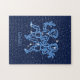 Puzzle mit dem Zodiaksymbol für Gemini in weichem silberblauem Weiß, überlagert mit den Sternen des Sternbildes, vor einem Sternenhimmel, der von tief Mitternachtsblau bis schwarz gestuft wird.