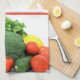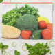 Gemüse auf rotem und weißem Streifen Geschirrtuch