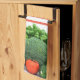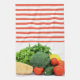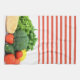 Dieses Küchenhandtuch ist mit freundlichen roten und weißen Streifen mit einem Overlay von grünem Gemüse und Tomaten ausgestattet. Ein niedliches Design für Ihre Küche oder für ein Hauswärmeschenk.