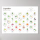 Infografisches Poster zur Veranschaulichung der Nährwerte von 32 der am häufigsten verwendeten Gemüsesorten, einschließlich ihres Makronutrientengehalts (Kohlenhydrate, Proteine und Fette), des Mikronährstoffgehalts (Mineralien und Vitamine) und der Kalorien. Die Nährwerte werden unter Berücksichtigung einer Serviergröße von 100 Gramm angegeben.