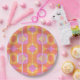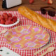 Die gemusterten, rosa und orangefarbenen Teller aus den 60er Jahren, die aus einer Tapete entworfen wurden, werden Ihre Gäste zweifellos verzaubern und eignen sich für jeden Anlass, wie zum Beispiel Mittag- und Abendessen, Picknick und Grillabende. Nachmittagstee und Ansammlungen. Zu den passenden Artikeln gehören Papierservietten. © Julie McIver.