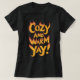 Eine digitale Illustration mit dem Text Cosy And Warm Yay! geschrieben in gelben und rot flammförmigen Buchstaben auf schwarzem Hintergrund.