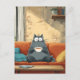 Eine niedliche, flauschig graue Katze sitzt weich mit Augen auf einem hellen orangefarbenen Sofa und klopft eine warme Tasse Kaffee. Das gemütliche Wohnzimmer ist mit Kissen, Büchern und rustikalem Charme ausgestattet. Diese skurrile Illustration ist perfekt für Katzenliebhaber und Kaffeeliebhaber geeignet und bringt Wärme, Spaß und Entspannung in jeden Raum. Ideal für Tasse, Drucke und Wohngestaltung.