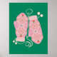 Ein Paar rosa Fäustlinge mit aufwändigen Mandala-Erholungen vor einem lebendigen grünen Hintergrund. Jede einzelne Handlung weist Herzakzente auf und ist durch eine knechte Kette mit flauschigen Pom-Poms verbunden, die festliche Wärme und fröhliche Wünsche ausstrahlt.